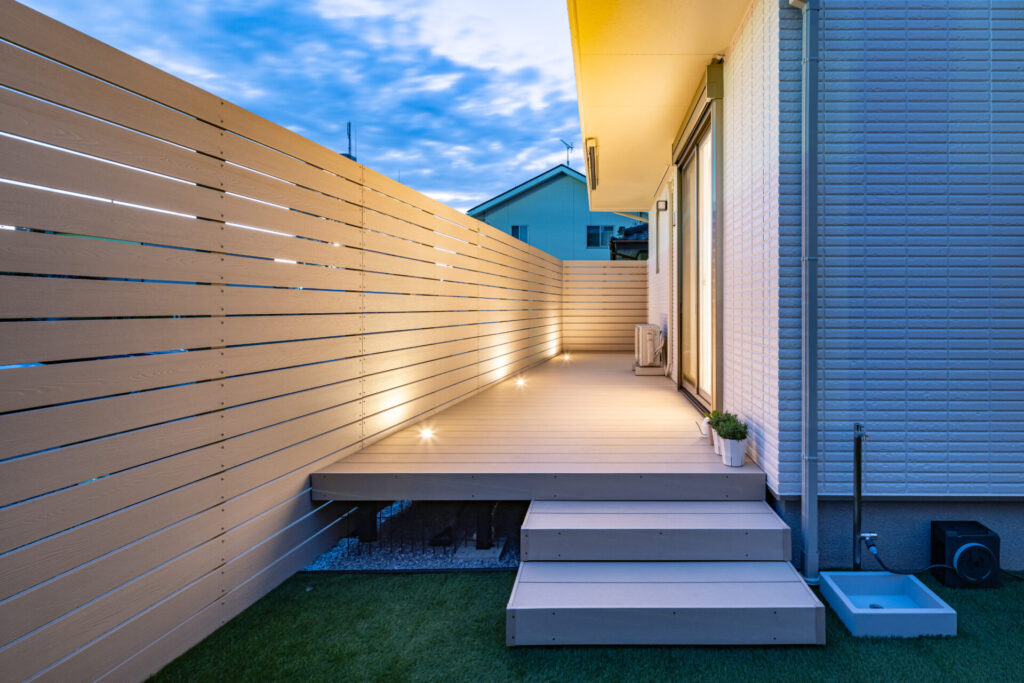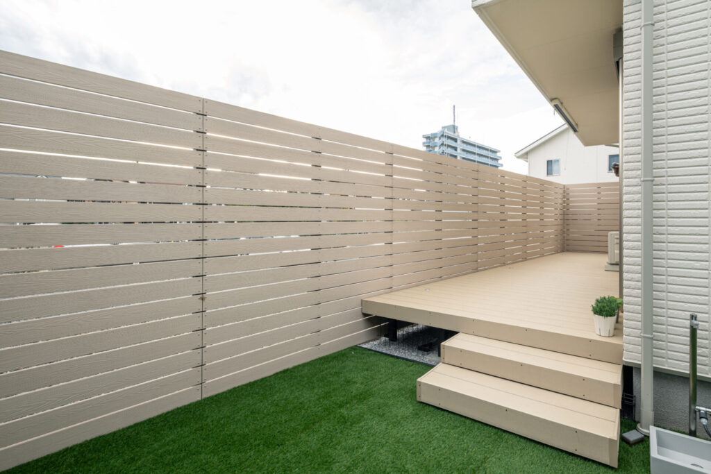 お庭はベージュ系のウッドデッキと目隠しフェンスと芝生で構成