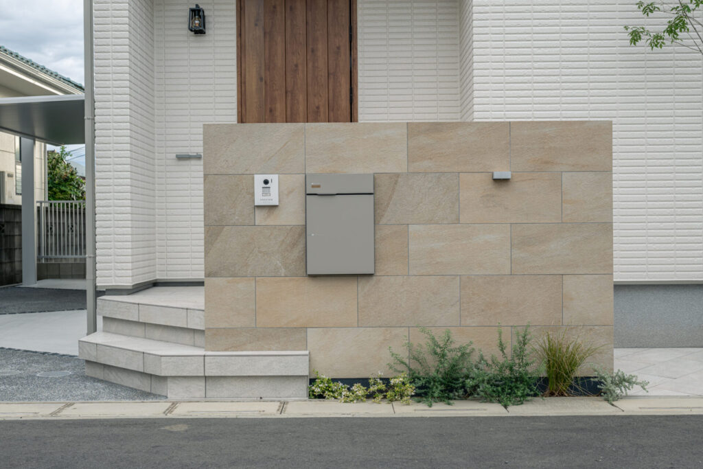 玄関前にベージュカラーのタイルと下にアクセントとなる黒ラインを入れたデザイン壁を設置。