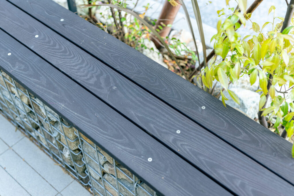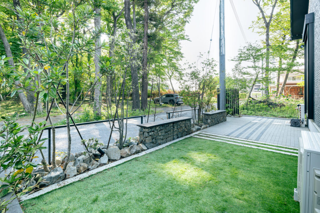 道路との境にはブロック塀や目隠しフェンスは使わずにシンプルなフレームとガビオンと天然木を組み合わせたベンチを配置しました。