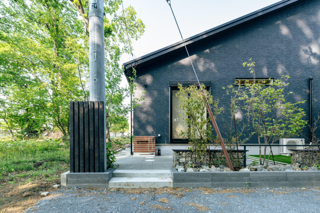 電柱を目出せないようにサビた鉄を模した角柱を設置、空間に上手に馴染んてくれます。