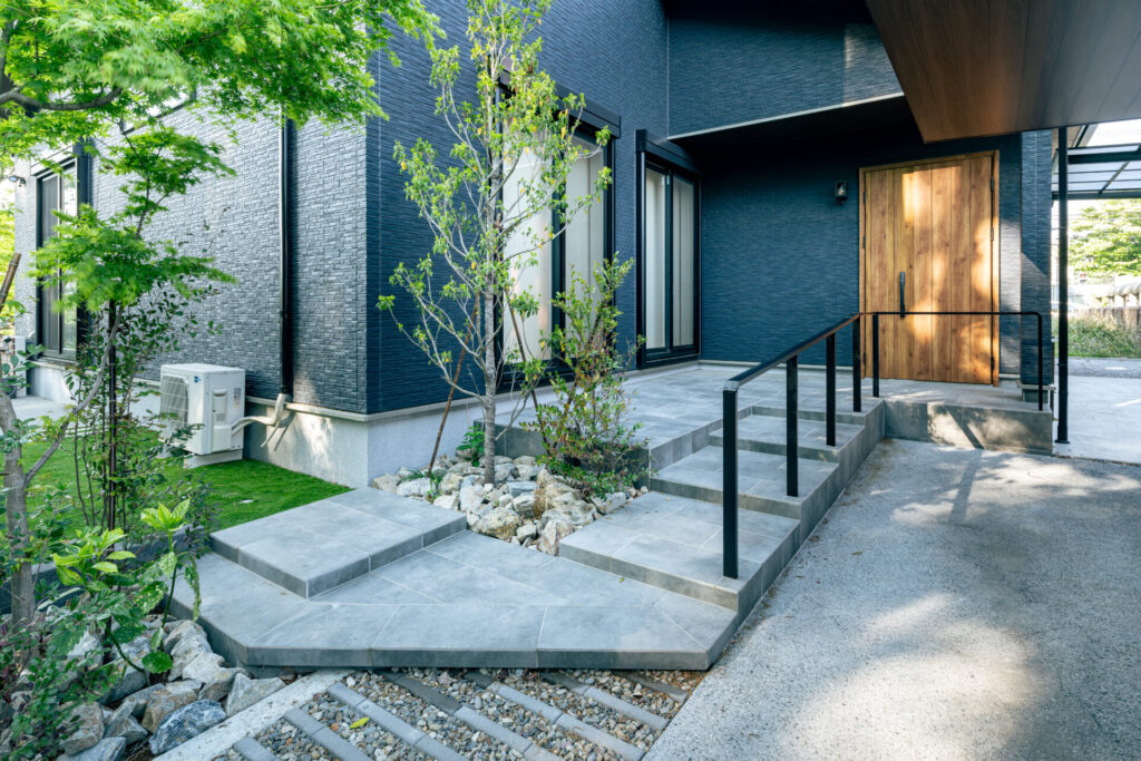 玄関ステップを大きく広げてタイルテラスのような使い方ができるようになっております。