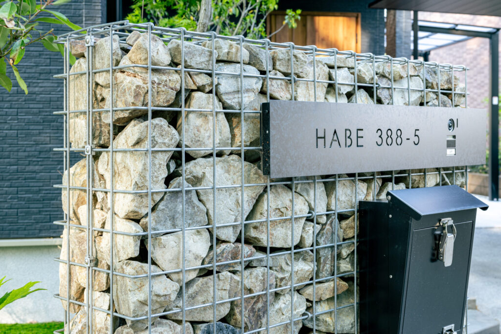 まず目を引くのが落ち着いたグリ石で構成されたガビオン門柱。